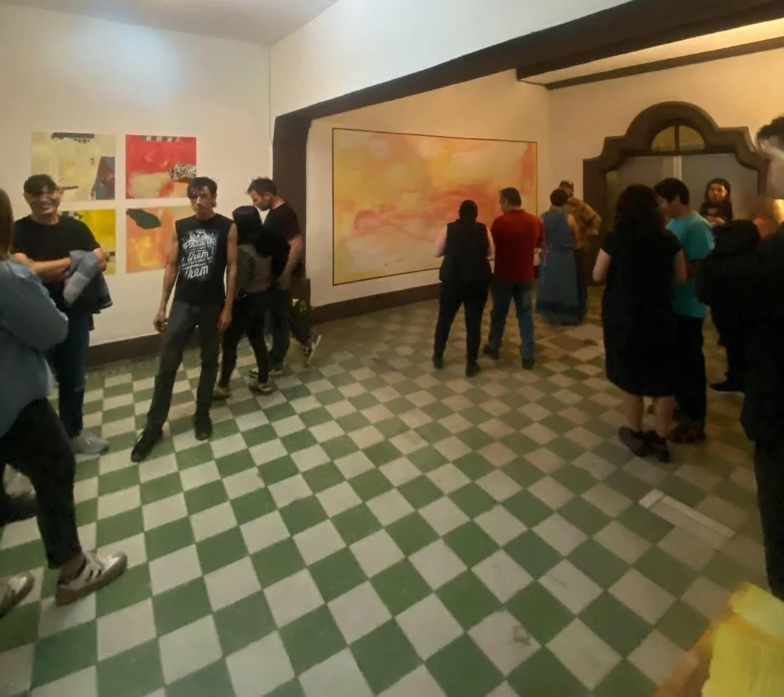 Using acrylic, oil pastel, and chicken wire, she builds layers of tension between structure and decay. Influenced by the local work of José Clemente Orozco, her sweeping, sunlit mural embraces scale and movement.